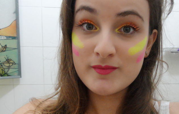 A sombra laranja/amarela neon ficou maravilhosa c: realçou seus olhos clarinhos hihih