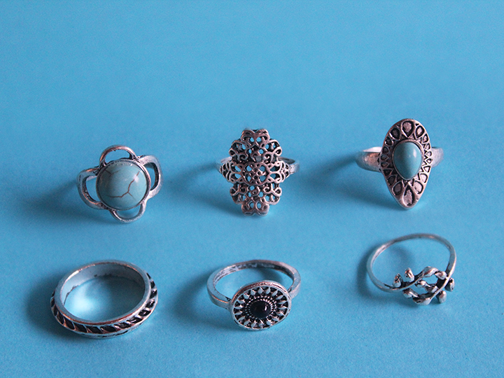 Dessa vez com “pedras turquesas”. Esse vem com 6 peças de anéis, mas mesmo assim vale a pena. Porque agora tá $1,20 que transferindo pro real dá R$3,80 (o preço da passagem aqui na minha cidade).